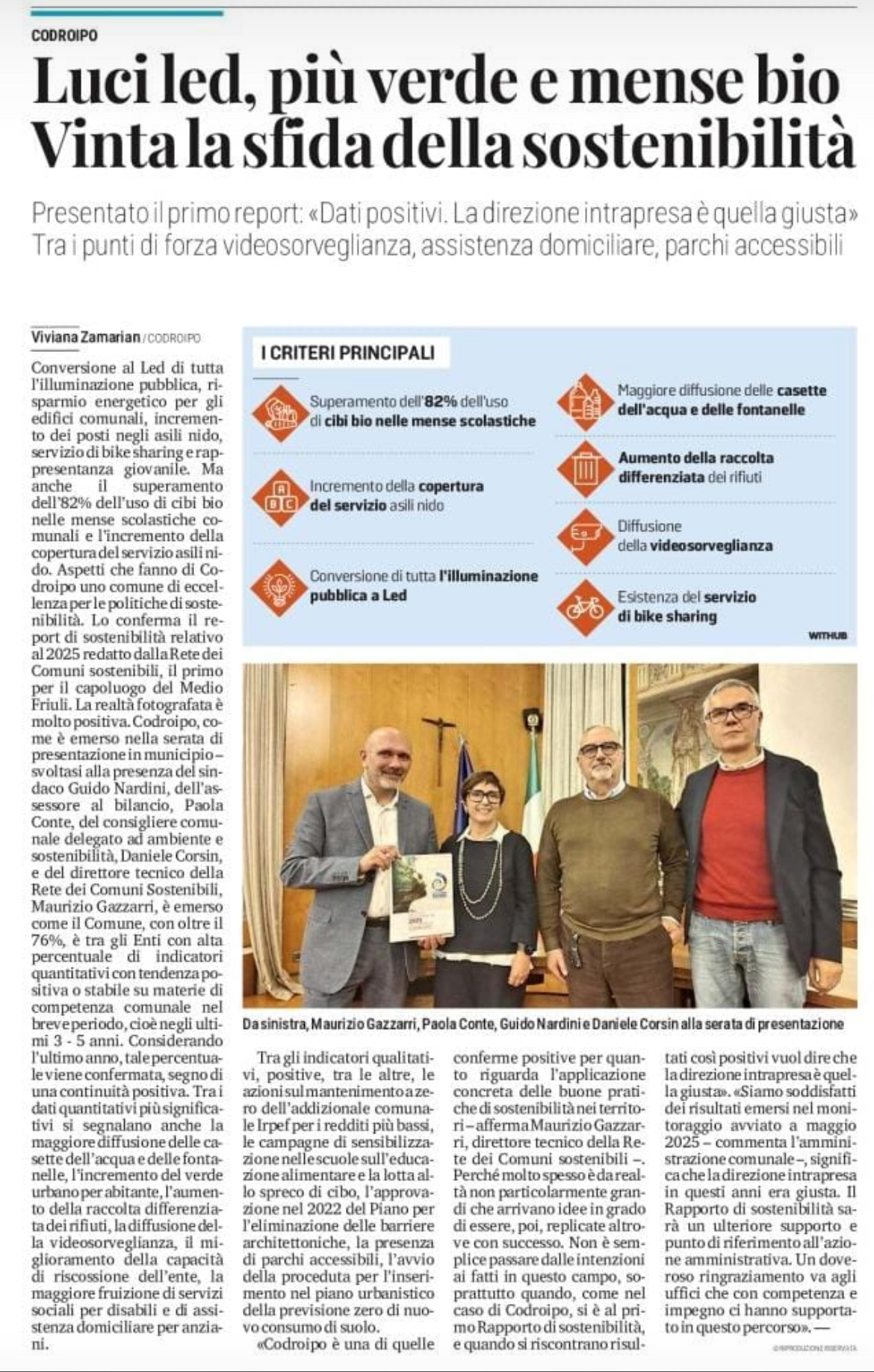 Tra gli indicatori qualitativi, positive, tra le altre, le azioni sul mantenimento azzeramento dell’addizionale comunale Irpef per i redditi più bassi, le campagne di sensibilizzazione nelle scuole sull’educazione alimentare e la lotta allo spreco di cibo, l’approvazione nel 2022 del Piano per l’eliminazione delle barriere architettoniche, la presenza di parchi accessibili, l’avvio della proceduta per l’inserimento nel piano urbanistico della previsione zero di nuovo consumo di suolo. “Codroipo è una di quelle conferme positive per quanto riguarda l’applicazione concreta delle buone pratiche di sostenibilità nei territori – afferma Maurizio Gazzarri, direttore tecnico della Rete dei Comuni sostenibili –. Perché molto spesso la realtà non è particolarmente grande che arrivano idee in grado di essere, poi, replicate altrove con successo. Non è semplice passare dalle intenzioni ai fatti in questo campo, soprattutto quando, come nel caso di Codroipo, si è al primo Rapporto di sostenibilità, e quando si riscontrano risultati così positivi vuol dire che la direzione intrapresa è quella giusta”. “Siamo soddisfatti dei risultati emersi nel monitoraggio avviato a maggio 2025 – commenta l’amministrazione comunale-, significa che la direzione intrapresa in questi anni era giusta. Il Rapporto di sostenibilità sarà un ulteriore supporto e punto di riferimento all’azione amministrativa. Un doveroso ringraziamento va agli uffici che con competenza ed impegno ci hanno supportato in questo percorso”-.